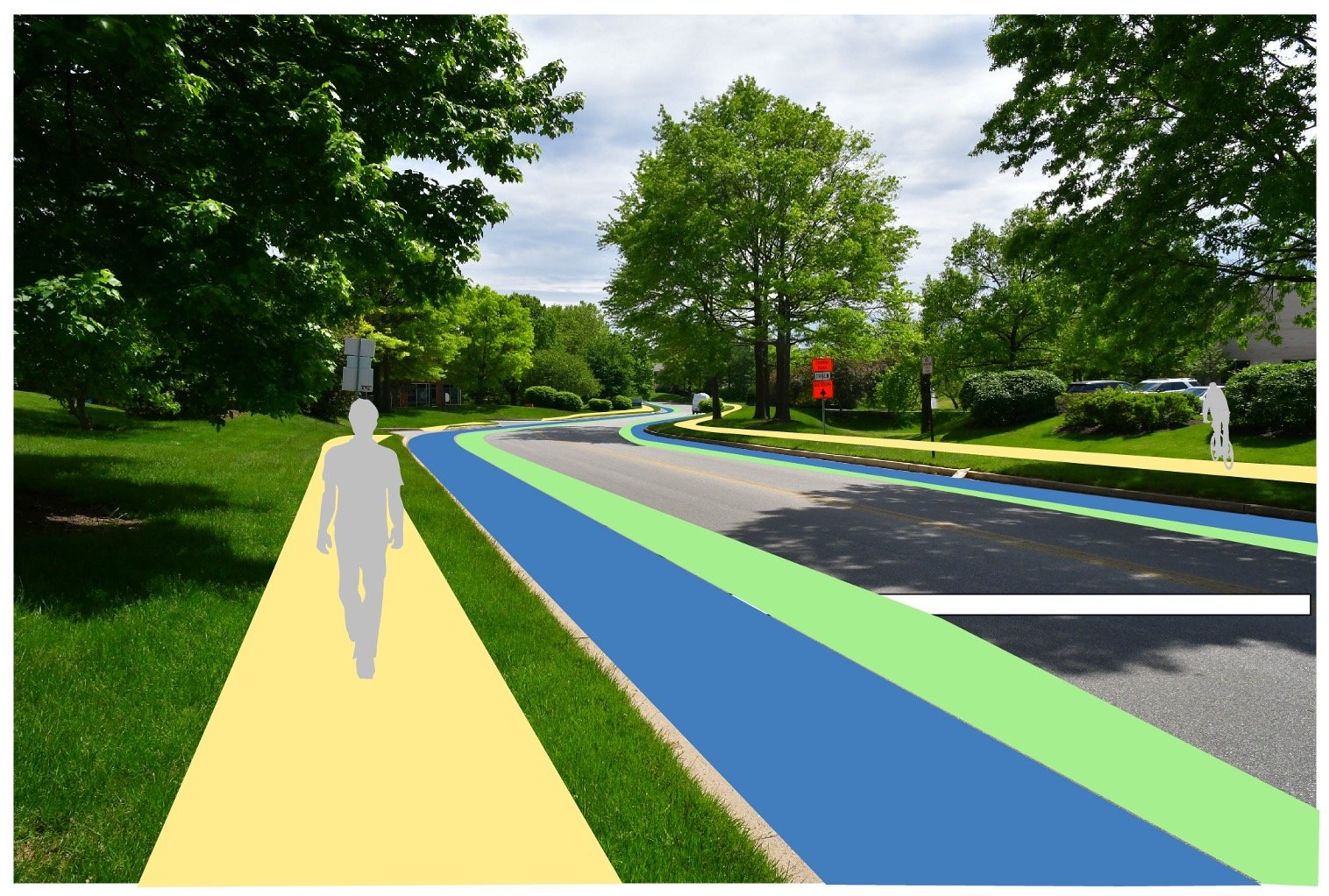 Option B introduces dedicated bike lanes in place of the center turn lane, offering an alternative approach to balancing traffic flow and multimodal access.