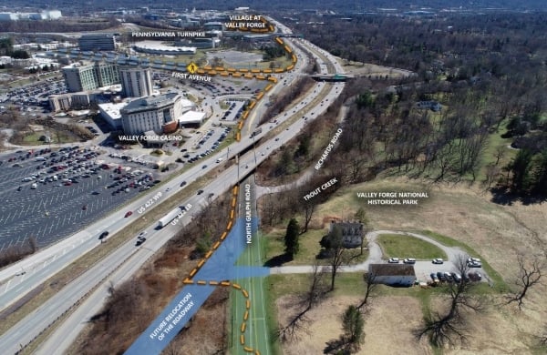 In 2015, the Montgomery County Planning Commission issued the Turnpike Corridor Reinvestment Project Report. This study identified transportation opportunities along the Turnpike Corridor that include potential slip ramp locations and redevelopment prospects. One of the proposed improvements is the Valley Forge Interchange into Moore Park. King of Prussia District continues to study this transportation improvement and hired Boles Smyth Associates to update information from the original study, including existing traffic volumes, base mapping and roadway changes to update the westbound on/off ramp designs and cost estimates. With design approval from stakeholders the District will start applying for federal transportation grants to build out the westbound ramp and eventually the full interchange.
