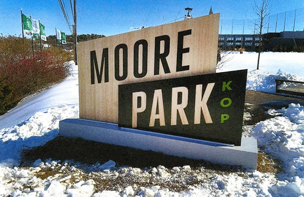 In 2017, King of Prussia District partnered with AgileCat and stakeholders on a rebranding process that renamed King of Prussia Business Park to Moore Park. In 2024, King of Prussia District engaged D2 Branding of King of Prussia, to build on this foundation by developing a wayfinding master plan. This plan called for gateway signs at Moore Park’s main entrances, directional signs identifying street names, address ranges and public points of interest, as well as pedestrian-scaled trail signs along the First Avenue Linear Park. These trail signs will highlight public points of interest and feature mileage markers indicating distances along the Linear Park. The first round of the sign master plan, three gateway signs at either end of First Avenue and Moore Road, were installed in early 2026.